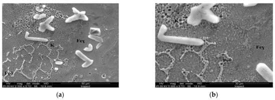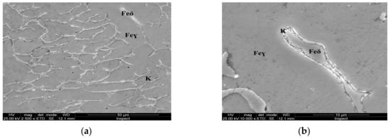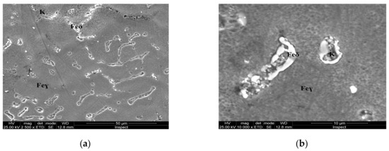 For the as-cast sample, the carbides (K) morphology is represented in the SEM microscopy images (Figure 5). Carbides with eutectic appearance are displayed also at the boundaries of the austenite grains (Feγ) (Figure 5a) or surrounding the Feδ phases (Figure 5b). The microstructural aspects of heat-treated samples B–E are presented in Figure 6, Figure 7, Figure 8 and Figure 9. In all these microstructures, one can observe the austenitic matrix (Feγ) with chromium-rich and molybdenum-rich fine complex carbides (K), M23C6 (CrFeMo)23C6 type and M7C3 (CrFe)7C3 type, and also small quantities of ferrite (Feδ), as islands.