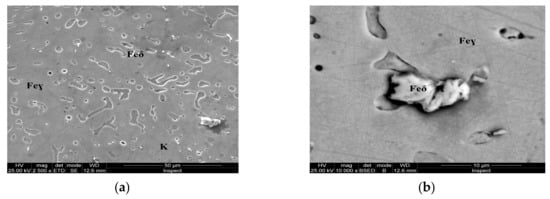 Microstructure of the AISI 316 modified stainless steel sample, heat-treated (Sample E): (a) Feγ base matrix, Feδ phase, and coarse carbides (K) ×2500; (b) detail of the coarse carbides, ×10,000.
