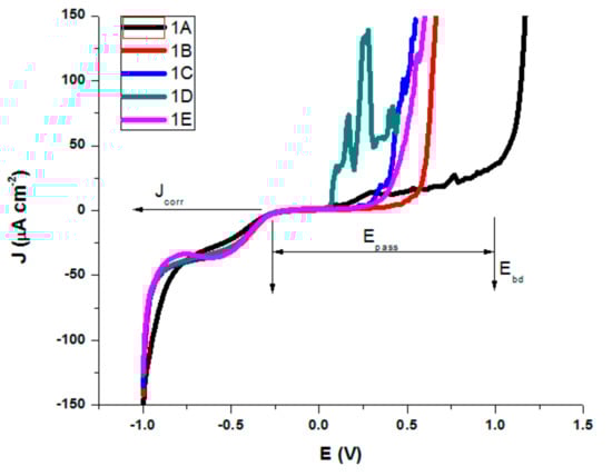 Similar behavior was observed for all treated AISI 316 modified stainless steel samples in Ringer’s solution, but with a slight difference in corrosion parameters. The testing parameters presented in Table 4 and Table 5 are as follows; corrosion potential (Ecorr), which represents the potential at which the anodic and cathodic reaction rates are equal; corrosion current density (Jcorr—the anodic current density at Ecorr) as a measure of the rate of corrosion (vcorr); polarization resistance (Rp); Tafel slopes of cathodic and anodic branch were used and both Tafel slopes (βc and βa); passive domain Epas (for which the anode current density is maintained almost constant); and breakdown potential (Ebd) obtained when a transpassive region was initiated and the anodic current density increased rapidly.