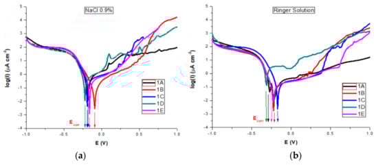 All corrosion parameters for all studied AISI 316 stainless steels in both saline solutions were determined from the corresponding polarization curves and Evans diagrams (Figure 12a,b).