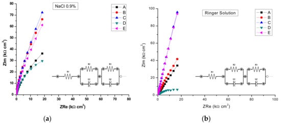 Nyquist Impedance spectra in complex plane in: (a) NaCl 0.9%; (b) and Ringer’s solution.