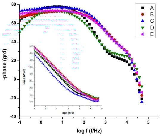 The data presentations in Bode plots (Figure 14) for NaCl 0.9% (similar plots obtained for Ringer’s solution not presented) give direct information about impedance, frequency, and phase, which helps ascertain the different constituent phases of the system more easily and the information was correlated with data from the Nyquist plots. In all experimental situations, the Bode plots show that, in the high frequency region, a capacitive behavior is predominant with slightly increased values of capacitance (Q) for NaCl as compared with Ringer’s solution measurements (Table 5 and Table 6).