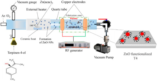 ZnO nanoparticle-functionalized terpinen-4-ol films were fabricated in a custom built capacitively coupled tubular (Quartz, l = 80 cm, d = 5 cm) radio frequency reactor (13.56 MHz, Advanced Energy, Fort Collins, CO, USA). Electrode separation was maintained at 8 cm for all the depositions. Substrates were placed 1 cm away from the leading electrode. Zinc acetyl acetonate hydrate [Zn(C5H7O2)2 xH2O] was placed in the clean ceramic boat and loaded in the middle of the reactor. External heating was used to vaporize Zn(acac)2 at a temperature of 140 °C. No external substrate heating was used during the deposition. A schematic of plasma polymerization apparatus and chemical structure of monomer is shown in Figure 1. The substrate temperature was found to be 40 °C during ZnO Np immobilization onto terpinen-4-ol surfaces. Terpinen-4-ol monomer flow rate was kept constant at 29 cm3/min. The polymerization of terpinen-4-ol was carried out at 10 W and the process pressure of 5 × 10−2 mbar. Terpinen-4-ol plasma polymers deposited at power of 10 W have been found to retain their inherent antimicrobial properties. Films deposited at higher power than 10 W have shown no antimicrobial properties, whereas one deposited at lower power are unstable under aqueous conditions [7,45]. A fine-tuning of plasma power, process pressure, and flow rate have been found to deposit a Terpinen-4-ol plasma polymer retaining a maximum antimicrobial property of the monomer. Either argon or oxygen were used as a carrier gas with latter providing hydrophilic modification of the surface of the as-deposited terpinen4-ol polymer matrix. Deposition of T4 monomer alone in either oxygen or argon plasma led to the wettability modification imparting hydrophilic/hydrophobic character to T4 polymer as compared to T4 polymer deposited in absence of carrier gas. Passing Zn(acac)2 vapor over the freshly deposited polymer led to in situ functionalization of the surface with ZnO nanoparticles. Flow rate of the argon and oxygen carrier gas was kept constant at 6 cm3/min. The desired thickness of the polymer was achieved by adjusting the deposition time.
