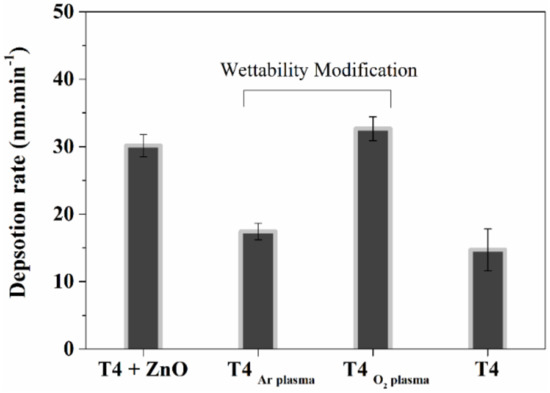 Deposition rate of T4 on silicon wafer substrate during wettability and nanoparticle modification. Deposition in either argon or oxygen plasma led to wettability modification. ZnO nanoparticle functionalization of T4 polymers is carried in O2 plasma.