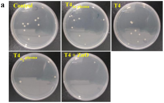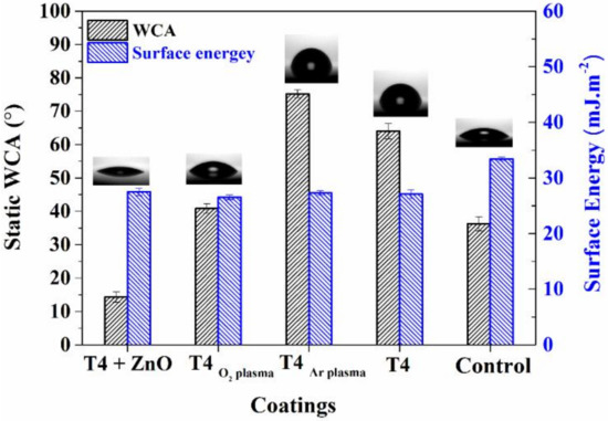 The combined effect of the hydrophilic surface along with the antimicrobial properties of T4 and ZnO is the possible reason for enhanced antibacterial performance of the T4O2 plasma and T4 + ZnO polymers. Microorganism approaching the surface would find it difficult to settle on the surface due to the hydration layer formed between the surface and adjacent water molecules in the first place. This would be followed by the killing of any attached microorganism by ZnO nanoparticles and T4 molecules. The internalization of ZnO nanoparticles by cells is found to induce oxidative stress, resulting in their death [64,65]. In addition, T4 molecules have the ability to compromise the cell membrane structure, inhibiting their growth resulting in the cell death [66,67].