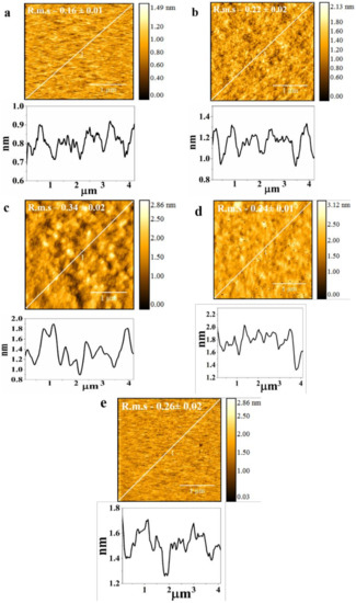 AFM images of (a) T4 O2 plasma, R.m.s = 0.16 ± 0.01 nm; (b) T4 Ar plasma, R.m.s = 0.16 ± 0.02 nm; (c) T4 + ZnO, R.m.s = 0.34 ± 0.02 nm; (d) T4, R.m.s = 0.24 ± 0.01; (e) Silicon substrate, R.m.s = 0.26 ± 0.02. Scanning area 3 μm × 3 μm. Line profiles of surfaces are also shown.