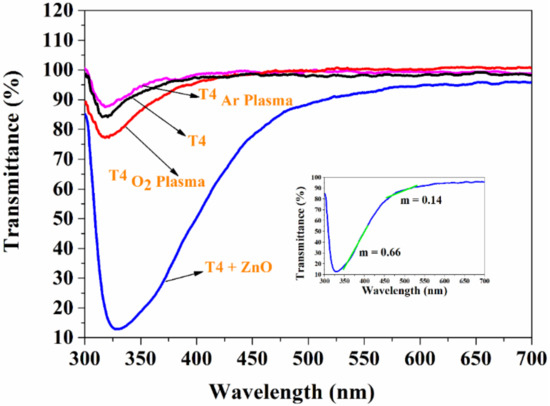 Transparency to visible light and UV absorption of modified T4 film were measured within 200–1000 nm range. The transmittance spectra of the modified films are shown in Figure 7. T4 films functionalized with ZnO nanoparticles showed significant UV-blocking in the 300–400 nm region. UV absorption by ZnO nanoparticles seems to be a possible explanation for this phenomenon. It is also worthwhile to note that the rate of decrease in UV light transmission is higher than that of visible light. This rate of decrease is shown in the inset graph, where m denotes the slope of the graph in the particular region as marked by the green line. Thus, the UV blocking property of this film can be further enhanced by increasing the ZnO concentration on the film surface. Thin films with high UV absorption and visible light transmission have a potential application as optically transparent food packaging materials and there are many other applications [61,62]. Light transmission in the visible range of 400–700 nm is greater than 90% for T4 films deposited in argon and oxygen plasmas. The oxygen plasma-deposited T4 exhibited some UV blocking property, though it was significantly lower compared to ZnO-functionalized T4 films.