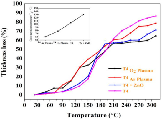Percentage thickness loss as a function of temperature estimated using ellipsometry data. The inset shows the glass transition temperature Tg of modified T4 plasma polymers. Tg was found to increase in the following manner T4 Ar plasma < T4 O2 plasma < T4 < T4 + ZnO.