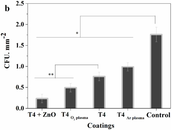 (a) photographs of E. coli colonies on agar culture plates after 24 h incubation on various T4 coatings; (b) colony forming units/mm2 on modified T4 surfaces and the control. All T4 surfaces showed a significant reduction in bacterial adhesion w.r.t. control (* p < 0.05). T4 + ZnO and T4 O2 plasma demonstrated a significant reduction in bacterial adhesion w.r.t. to T4 (** p < 0.05).