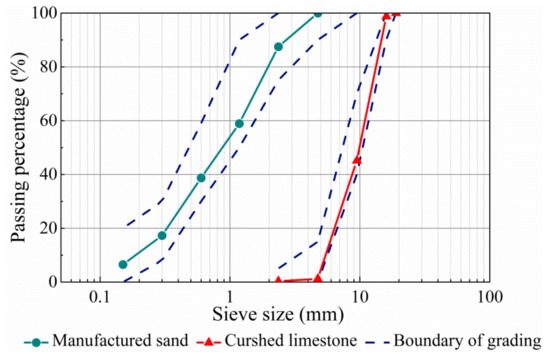 The fine aggregate was manufactured sand with a fineness modulus of 2.9 and the density of 2689 kg/m3. The coarse aggregate was crushed limestone with a maximum particle size of 16 mm and density of 2766 kg/m3. The water absorption of fine and coarse aggregates was 2.0% and 1.18% respectively, which were considered to adjust the water dosage of the mixture. The grading curves of fine and coarse aggregates presented in Figure 1 met the specifications of China codes GB/T 14684 and GB/T 14685 [35,36]. The steel fiber has hook-ends with the circular section as exhibited in Figure 2, the length lf = 29.8 mm and the diameter df = 0.5 mm, the aspect ratio lf/df = 60, the tensile strength was 1150 MPa.