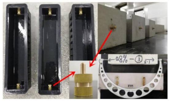 The drying shrinkage was measured in accordance with the China code JG/T 472 [42]. The prism specimens of 100 mm × 100 mm × 515 mm were used, three of them were tested as a trial. As displayed in Figure 4, the copper probes were embedded in ends of the mold before casting. After casting and until demolding, the surface of specimens was covered by a waterproof plastic film to prevent the evaporation of water. All specimens were demolded after 24 h and cured in a standard curing room with temperature of (20 ± 2) °C and RH of 95% for 2 days, and then moved into a chamber with constant temperature of (20 ± 2) °C and RH of (60 ± 5)%, while the initial length of specimen was measured immediately. The length of specimen was measured by using outside micrometer with accuracy of 0.001 mm. Drying shrinkage was calculated by Equation (2):