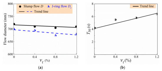 Variations of workability indexes with vf: (a) Diameter of slump-flow and J-ring flow; (b) T50.
