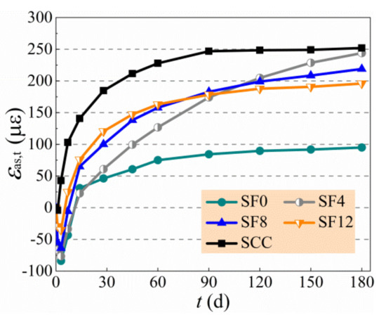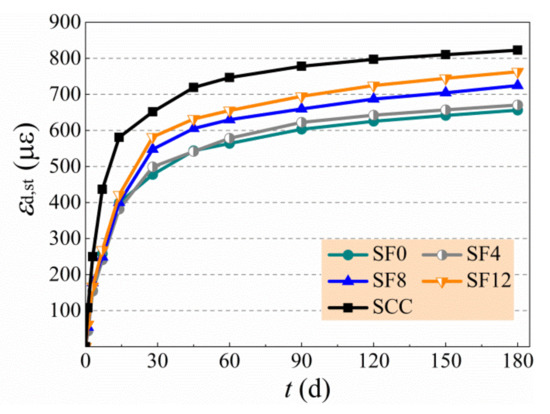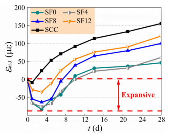 The test results of autogenous shrinkage of specimens are exhibited in Table 6 and Figure 6, and the growth of expansive deformation is displayed in Figure 7, of which the negative and positive values of Y-axis are the expansive and shrinkage deformation, respectively. In general, the autogenous shrinkage grew rapidly within the first month and then developed slowly and tended to be steady [11,20,45]. The SCC had a highest autogenous shrinkage due to no expansive agent admixed, and the SF0 had a lowest autogenous shrinkage due to the free development of expansive deformation. With the increase of the vf from 0.4% to 1.2%, the autogenous shrinkage of self-compacting SFRC compared with SCC at 180 d reduced by 22.2% to 3.2%. The change of autogenous shrinkage of self-compacting SFRC with a varying vf is controlled by the complex effect of steel fibers. On the one hand, the rigid skeleton support of steel fibers reduces the autogenous shrinkage of self-compacting SFRC. On the other hand, the bridging effect of steel fibers confines the expansion of self-compacting SFRC. In this study, the autogenous shrinkage of self-compacting SFRC increased due to the weakness of aggregate skeleton with the increase of binder to coarse-aggregate ratio and sand ratio, while the expansion of self-compacting SFRC changed slightly with a constant dosage of expansive agent. Therefore, with the increase of the vf from 0.4% to 1.2%, the expansion rate of self-compacting SFRC reduced 58.2% at the early 3 d, and the expansive time of SF12 was shorted as about half of SF4. Similar results were reported in literatures [28,29,30]. This led to the higher autogenous shrinkage before 90 d, and the autogenous shrinkage at 28 d of SF12 was about twice that of SF4. With the increase of curing age, however, the autogenous shrinkage of self-compacting SFRC decreased by the bridging effect of steel fibers strengthened with the increase of vf. In this study, the autogenous shrinkage of SF4 and SF8 still grew obviously after 90 d, but the autogenous shrinkage of SF12 tended to be steady, which led to the autogenous shrinkage of self-compacting SFRC decreasing with the increased vf from 0.4% to 1.2% after 90 d.