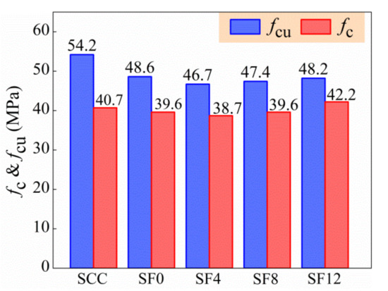 The test results of cubic compressive strength (fcu) and axial compressive strength (fc) of specimens are shown in Figure 9. All reached the target cubic compressive strength of 46.6 MPa. Due to the unconfined transversal expansion of specimens with the addition of expansive agent, the fcu and fc of SF0 compared with SCC decreased by 10.5% and 2.7%. This is similar as it was reported the expansive agent has more influence on cubic compressive strength than axial compressive strength of SCC [26,27]. With the increase of the vf from 0.4% to 1.2%, the fcu and fc of self-compacting SFRC increased by 3.2% and 9.1%. This attributes to the inhibition effect of steel fiber on the unconfined transversal expansion of specimens; the cubic specimens were less inhibited than the cylinder specimens due to the different height of specimens. Differing from that the compressive strength of self-compacting SFRC reduced with the increase of the vf reported [10,12,13,19], the compressive strength of self-compacting SFRC in this study trends to be increased with the incorporation of expansive agent and steel fibers.