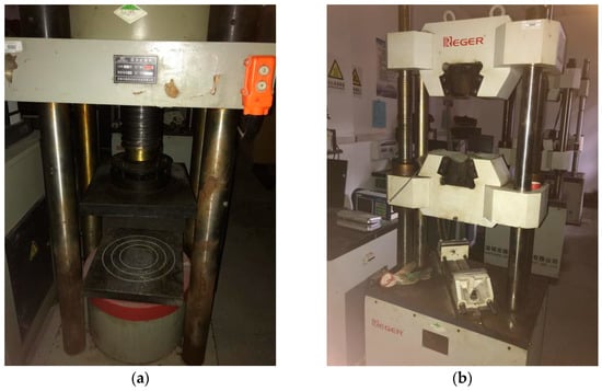 The YAW-2000 compression-testing machine provided by Center of Engineering Materials at Chongqing University was used as the concrete compression strength instrument, as shown in Figure 2a. Its technical parameters are presented in Table 1. The RE-8060G electro-hydraulic servo universal testing machine of microprocessor control provided by Center of Engineering Materials at Chongqing University was used for the experimental apparatus for concrete flexural strength, as shown in Figure 2b. Its technical parameters are presented in Table 2.