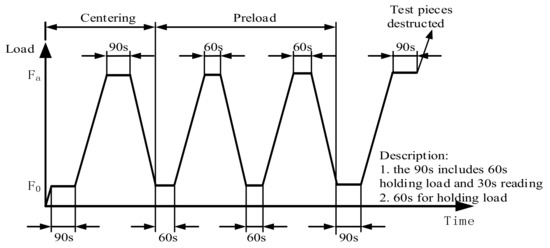 Subsequently, the load was reduced to the benchmark stress of 0.5 MPa at the same loading speed, and repeated the above process for two times after the loading duration was kept for 60 s. Then the benchmark stress was kept for 60 s, and the deformation at various measurement points was recorded. Subsequently, the load was increased to 1/3 of axial compressive strength at the same speed, the loading duration was kept for 60 s, and the deformation at various measurement points was recorded. Finally, the deformation measuring instrument was removed, and the load was increased at the same speed until the sample was destroyed. The failure load was recorded, and the schematic diagram for loading is shown in Figure 4.