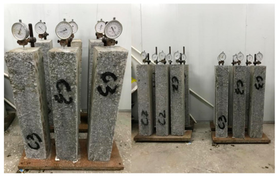 The drying shrinkage experiment followed the Standard for Test Methods of Long-term Performance and Durability of Ordinary Concrete (GB/T 50082-2009), and the contact method was adopted as the test method. The size of the samples was 100 mm × 100 mm × 515 mm, and the preparation and curing for samples were the same as the conditions for mechanical properties test. The measuring head was affixed to the samples after the mold was removed, and then it was placed in the standard curing room for 3 days. After being taken out, it was immediately put into the drying room under the temperature of (20 ± 2) ℃ and relative humidity of above (60 ± 5) %. The dial indicator was fixed on the standing support, and the support should not be influenced by external vibration. After the dial indicator was installed, the sample was put on the support for reading of the first time, as shown in Figure 5. Shrinkage data was recorded at the ages of 1, 3, 7, 14, 28, 45 and 60 days.