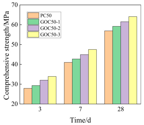 Figure 6 presents the change of the compressive strength for concrete with different GO contents at the age of 3, 7, and 28 days. According to the figure, the adding of GO can considerably enhance the compressive strength of concrete. Moreover, the compressive strength of concrete increases with the rise of GO. This trend at different ages (3, 7, and 28 days) is the same. According to the experiment, the compressive strengths of PC50, GOC50-1, GOC50-2 and GOC50-3 samples at the age of 28 days are 56.9 MPa, 59.2 MPa, 61.5 MPa and 64.1 MPa, respectively.