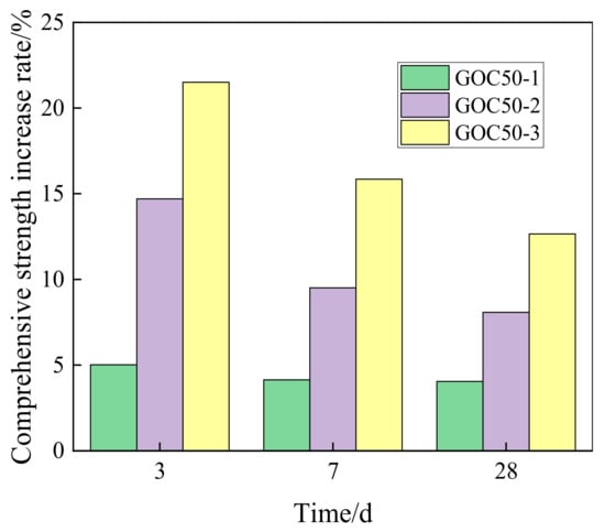 According to the increasing rate of compressive strength presented in Figure 7, the higher the dosage of GO is, the higher the increasing rate of compressive strength at the same age will be.