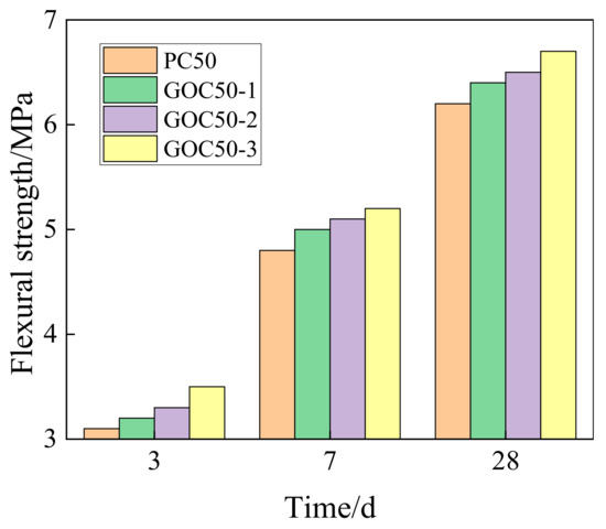 Comparatively speaking, the influence of GO on flexural strength is smaller than the influence on compressive strength. For example, at the age of 28 days, GOC50-3 can increase the compressive strength by 12.65% with respect to PC50, but can only increase the flexural strength by 7.38%.