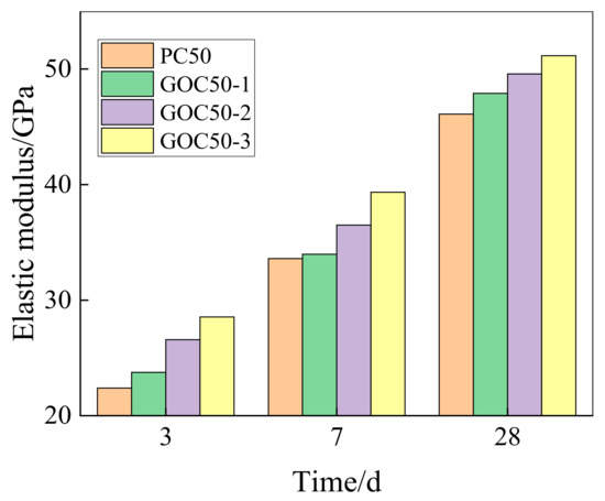 - The enhancement effect of GO nanosheets on early-stage elasticity modulus of concrete is relatively big. The higher the GO content is, the higher the increasing rate of elasticity modulus will be. GO nanosheets can increase the elasticity modulus of concrete at the age of 3 days by 6.05–27.46%, and increase the elasticity modulus at the age of 28 days by 3.92–10.97%.