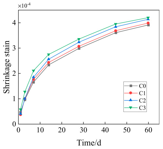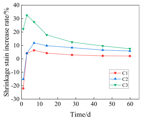 According to the figure, the GO mainly has a big influence on the early-stage shrinkage strain of concrete. On the first day, the shrinkage strain of GO concrete changes within the scope of −22.22–22.22% when compared with that of ordinary concrete. On the third day, the shrinkage strain of concrete with the GO dosage of 0.08 wt% shows the highest increasing rate, which is 32.43%. Later, the shrinkage strain increasing rate of GO concrete in different groups decreases. On the 60th day, the increasing rate of various groups drops to 7.45%. The concrete with the GO dosage of 0.02 wt% has the smallest influence, and the increasing rate of its shrinkage strain with respect to ordinary concrete is only 1.99%.