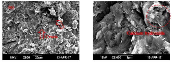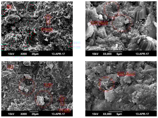 In addition, the SEM figure in [20] verifies the above conjecture. According to Figure 14, with the adding of 0.06 wt% GO nanosheets, cracks and pores in the cement paste tend to decrease and shrink, as shown in Figure 14b. In addition, the percentage of GO nanosheets content is relatively low and it is uniformly distributed, so severe gathering, aggregation or granulation signs do not appear. When the dosage of GO nanosheets reaches 1.00 wt%, the number of harmful pores decreases, and the texture structure becomes more compact, as shown in Figure 14c. This shows that the microstructure of cement becomes more compact, the generation of more regular crystalline compounds is promoted, and the cement performance is improved accordingly.
