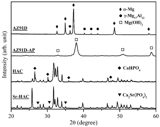 X-ray diffraction patterns of the AZ91D Mg alloy, alkaline pre-treated AZ91D-AP, hydrothermally synthesized hydroxyapatite coating (HAC) and strontium-substituted hydroxyapatite coating (Sr-HAC) surface coatings.