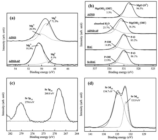 Figure 3 shows the high-resolution Mg 2p, O 1s, Sr 3p and Sr 3d XPS spectra. Figure 3a shows a representative high-resolution Mg 2p band and curve-fitting results of the AZ91D Mg alloy and AZ91-AP specimens. Considering the untreated AZ91D substrate, the Mg 2p band is deconvoluted into two peaks at binding energy (BE) about 49.3 eV and BE = 50.3 eV corresponding to metallic magnesium (Mg0, 71.5%) and Mg2+ ions (28.5%) in native magnesium oxide (MgO) or hydroxide (Mg(OH)2), respectively [43]. After performing the alkaline pre-treatment on AZ91D Mg alloy, the significant increasing intensity and integration area of the Mg2+ ions bonding peak from 28.5% to 91.9% can be attributed to the formation of brucite Mg(OH)2 surface layer (see Figure 3a cf. Figure 1) on AZ91D Mg alloy. Figure 3b shows representative high-resolution O 1s bands and curve-fitting results of the AZ91D, AZ91D-AP, HAC and Sr-HAC specimens. The corresponding O 1s band of the AZ91D substrate consists of two components at BE = 530.0 eV and BE = 531.5 eV, which correspond to the surface native magnesium oxide (MgO) and hydroxyl groups (OH¯) of the magnesium hydroxide (Mg(OH)2), respectively. As a result of Figure 3a,b, it can be recognized that MgO is the major product on the grit-blasted surface of Mg alloy. After the alkaline pre-treatment, the O 1s band of AZ91D-AP can be deconvoluted into two peaks at BE = 531.5 eV and BE = 533.0 eV corresponding to the OH¯ groups in hydroxide (Mg(OH)2) and surface absorbed H2O [44], respectively. The significantly increasing integration area of OH¯ groups in hydroxide (from 5.5% to 76.3%) results from the formation of Mg(OH)2 surface layer on AZ91D Mg alloy after the alkaline treatment. Considering the O 1s band of HAC and Sr-HAC specimens, the deconvoluted peaks located at about BE = 531.0 eV and BE = 532.5 eV represent the presence of P-O bond in phosphate groups (PO43–) and P-OH bond of the apatite crystal structure, respectively [44]. As a result, similar peak intensity and integration area percentage of P-O and P-OH bonds represent that hydrothermally synthesized HAC and Sr-HAC coatings both exhibit well crystallized apatite crystal structure. Moreover, XPS analysis can be used to evaluate the substitution of Sr2+ ions on the chemical state of the Sr element in the coatings. The corresponding Sr 3p band of the Sr-HAC specimens presented in Figure 3c consists of two components at BE = 279.6 eV and BE = 268.8 eV, which correspond to the Sr 3p1/2 and the Sr 3p3/2 bands, respectively. The Sr 3d band is deconvoluted into two peaks at about BE = 134.7 eV and BE = 132.9 eV corresponding to Sr 3d3/2 and Sr 3d5/2 bands (see Figure 3d), respectively [45]. Based on the XPS analysis results, the detected Sr 3p and Sr 3d bands confirm that Sr2+ ions can be substituted into the HA crystal structure by the hydrothermal synthesizing process. The measured molar ratios of Sr/(Ca+Sr) and (Ca+Sr)/P are about 0.096 and 1.623, respectively. Therefore, the chemical composition of Sr-HAC can be expressed in the formula of Ca9Sr(PO4)6(OH)2, which is close to the identified phase composition through the XRD analysis.