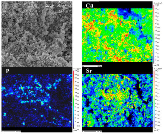 The EPMA analysis for Ca, P and Sr element distribution on the surface of Sr-HAC.