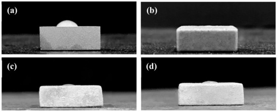 Hydrophilicity of the (a) grit-blasted AZ91D Mg alloy, (b) alkaline pre-treated AZ91D-AP, hydrothermally synthesized (c) HAC and (d) Sr-HAC specimens.