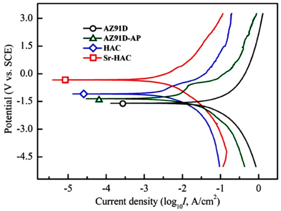 Potentiodynamic polarization curves will provide information on the corrosion behaviors. Figure 7 shows the corrosion test results in terms of the potentiodynamic polarization curves of the AZ91D Mg alloy, AZ91D-AP, HAC and Sr-HAC specimens in the SBF solution at 37 °C. The values of corrosion potential (Ecorr., VSCE) and the estimated corrosion current density (Icorr., μA/cm2) are obtained through the Tafel extrapolation method. The corrosion current density is calculated from the polarization resistance (Rp, kΩ-cm2) by the Stern–Geary equation.