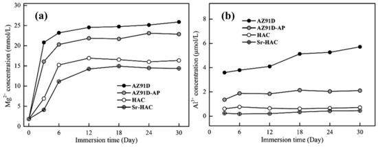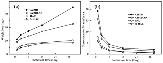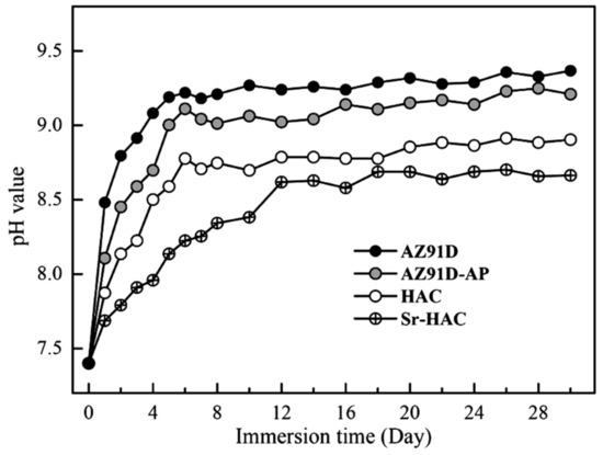 Figure 11 represents the weight loss results and corresponding corrosion rates (PW, mm/year) evaluated after long-term immersion tests in the SBF solution for 1, 3, 7, 14 and 30 days at 37 °C. As shown in Figure 11a, it is observed that the weight losses increase with increasing immersion time for all the specimens. However, the weight losses are obviously reduced and became stabilized for both hydrothermal HAC and Sr-HAC specimens after 14 days of immersion. In addition, the corrosion rates significantly decrease with the prolongation of immersion duration, especially within the initial 3 days as illustrated in Figure 11b. With the extension of the immersion time, the corrosion rates of the specimens are reduced, and the values tend to stable after 14 days of immersion. Compared with the corrosion rate of the naked AZ91D substrate, the reduction percentages of corrosion rates for the alkaline pre-treated AZ91D-AP, hydrothermal HAC and Sr-HAC specimens are about 18.2% to 21.5%, 60.6% to 70.5% and 70.1% to 75.2% during the immersion durations, respectively. The hydrothermal HAC and Sr-HAC specimens shows similar long-term dissolution behaviors; nevertheless, the Sr-HAC still represents slightly lower corrosion rates than the HAC during the whole immersion period. As a result, we can see the average weight loss and corrosion rate of hydrothermal HAC and Sr-HAC specimens are significantly lower than that of AZ91D and alkaline pre-treated AZ91D-AP.