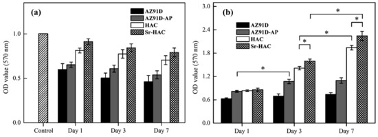 The cell viability of MG63 cells on the AZ91D, AZ91D-AP, HAC and Sr-HAC specimens are estimated through the absorbance value from MTT assay after culturing for 1, 3, and 7 days, respectively, as shown in Figure 12b. During the incubation durations, we can see the cell number on the uncoated AZ91D substrate is generally lower than that on the surface-treated specimens. Therefore, it can be recognized that surface treatments with protective coatings can improve the cell viability for biodegradable Mg alloys. After 1 day of culture, the cell numbers in the media of the AZ91D-AP, HAC and Sr-HAC specimens represent no statistically significant differences (p > 0.05). After 3 days of culture, the cell numbers on the AZ91D-AP, HAC and Sr-HAC specimens are significantly increased (p < 0.05). It is noted that the cell viability on hydrothermal HAC and Sr-HAC specimens are significantly higher than that on the alkaline-pre-treated AZ91D-AP specimens. In addition, the cells cultured on Sr-HAC specimens show slightly higher viability with the difference (p < 0.05) than that of cells on HAC specimens. After 7 days of culture, the number of cells cultured on the hydrothermal HAC and Sr-HAC specimens is further increased, and the Sr-HAC specimens still show significantly higher cell viability than the HAC specimens (p < 0.05). However, there is no significant difference in the cell viability for the AZ91D-AP between 3 and 7 days of culture.