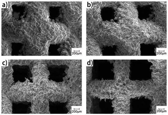 The as-built samples have a similar appearance in comparison to the design models, as shown in Figure 3. However, Figure 4 shows a very rough surface on the as-built strut; there are many unmolten or semi-melt spherical particles adhering to the strut surface; and the size of these particles is very close to that of the Ti64 powder in Figure 2a. Fortunately, the bound metal particles can be removed by sand blasting and post treatment [20].