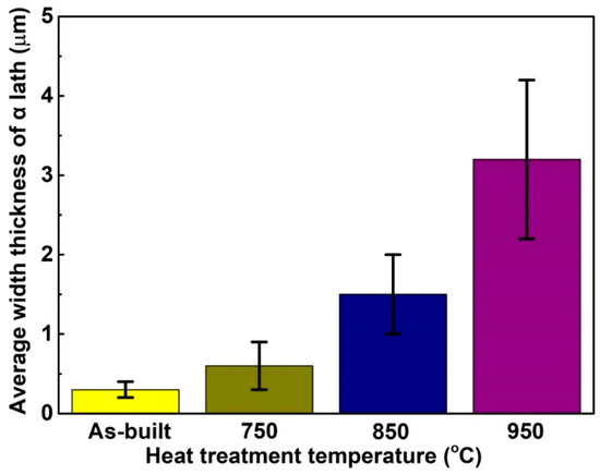 Figure 5 shows the microstructures of the porous Ti64 samples before and after heat treatment. The microstructure of the as-built sample is mainly composed of acicular α′martensite, because of the extremely high cooling rate during laser melting process, making the β domain phase transform to fine α′martensite [21]. Some pores were found in the as-built sample, as shown in Figure 5a,b. This defect may have been caused by the heat wave airflow that could not escape during the solidification, and this defect may have an unfavorable effect on the mechanical properties of as-built samples [22]. For the samples heat-treated at 750 °C and 850 °C, it is clear that the fine α′martensite began transforming to an α + β lamellar mixture microstructure, and α phases began to present a lath pattern, but there is still some needle-like α phase in their microstructures, as illustrated in Figure 5c–f. And comparing Figure 5 d–f, the microstructure is more uniform and the α lath is coarser for the samples heat-treated at 850 °C. In the case of the specimens heat-treated at 950 °C, the fine α′martensite completely transformed to a mixture of α + β, and the α phase showed a more obvious lath pattern, as shown in Figure 5g,h. In short, with the increase of the heat treatment temperature, the average width of the lamellar α phase gradually increased, as illustrated in Figure 6. When heat treatment temperature increased to 950 °C, the average width of α lath increased to 3.1 μm, as shown in Figure 6.