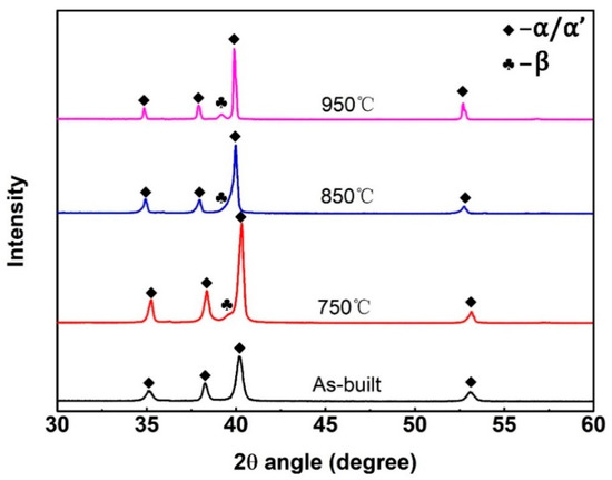 Figure 7 shows the XRD patterns of the as-built and heat-treated samples. According to pervious research [23], it is difficult to distinguish between α and α′phases, because those two phases have a similar hexagonal (hcp) structure; therefore, all peaks of as-built samples can also be considered α or α′phase. The XRD peak intensity of the β phase is relatively low for the samples heat-treated at 750 °C and 850 °C; it is even hard to see the presence of the β-peak. This indicates that these samples contain very low transformed β phase. And the β phase peak intensity is higher for the samples heat-treated at 950 °C. The content of β phase in this heat treatment condition is still low, according to previous research [17].