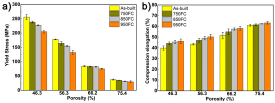 In this study, a stress–strain of 10% for the sample being tested was selected as the compressive strength. Table 3 compares the mechanical properties of porous Ti64 structures before and after heat treatment. It can be seen from Table 3 and Figure 10a that the compressive strength, platform stress, elastic modulus, and yield stress of the porous structure gradually decreased, when the porosity of the sample increased. At the same time, the compressive strengths and yield strengths of samples with the same porosity decreased as the heat treatment temperature increased. Among them, the samples with lower porosity had a more considerable reduction in yield strength, with the reduction of 19.9%, and the yield strength of samples heat treated by 950 °C decreased from 255.8 MPa to 204.9 MPa. However, from Figure 10b, it can be seen that the compression elongation of the sample increased with the increase of heat treatment temperature. The samples with lower porosity had a lower compression elongation. The maximum increase in compression elongation reached 14.7%, because the α′ phase in the as-built sample gradually transformed to coarse α + β lamellar microstructure. The lamellar microstructures can change the crack path of the sample during fracture and increase the compressive elongation of the heat-treated samples [18,24]. Under the same porosity, the heat treatment has little effect on the elastic modulus of samples with the same porosity, and the change in the elastic modulus of the samples after heat treatment was less than 8%.