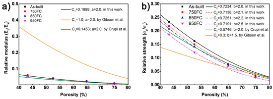 While the heat treatment temperature increased, the yield strength of the porous structure with the same porosity gradually decreased. Therefore, in this study, four prediction models for the relationship between yield strength and porosity were obtained, and the predicted curves of Crupi et al. [12] were closely to this work, as shown in Figure 11b. It can be observed that as the heat treatment temperature increased, the b value in the yield strength prediction model increased from 2.0 to 2.5, and the curve of the yield strength prediction model gradually moved down.