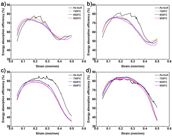 The energy absorption efficiency curves of porous Ti64 structures with different porosities after different heat treatments: (a) 46.3%; (b) 56.3%; (c) 66.2%; (d) 75.4%.