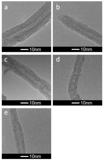 HRTEM images showing the influence of oxidation/unsheathing on the thickness of CNTs applied during the EPD process for oxidation times: (a) 10, (b) 15, (c) 30, (d) 75, (e) 90 min.
