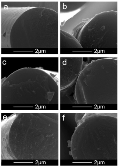 Electrophoretic deposition (EPD) is one of the most popular and promising methods for the preparation of different nanostructured surfaces and devices [1,2], especially carbon nanotube (CNT)-reinforced fibers [3,4,5]. It was shown [6] that the ultrasonically assisted (i.e., ultrasound is applied throughout the deposition process) EPD of CNTs and nanotube forests [7] on carbon fibers (CFs) or on glass [8,9,10] improved the mechanical properties, interfacial shear strength, and friction resistance [11] of the final fibrous hierarchical composites. CNTs have been applied to improve the ablation resistance of carbon–carbon composites working at very high temperatures [12]. Here other techniques, such as the catalytic growth of CNTs, are not applicable due to the co-introduction of metal residues. Thus, EPD can be successfully applied [12]. Additionally, an improvement of the roughness and surface polarity of CNTs by EPD can lead to wettability improvement [13]. For example, Li et al. [14] studied the wettability of CNT-coated CFs and noticed the decrease in the water contact angle (WCA) with the increasing roughness caused by CNT electrodeposition. Jiang et al. [15] reported the WCA on CF to be equal to ca. 76°, which decreased to 57–51° after nanotubes deposition depending on the application of ultrasonication during the process.