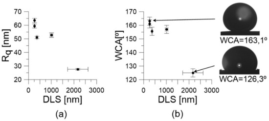 (a) The correlation between roughness factor (Rq) and DLS diameter; (b) The relation between water contact angle (WCA) and DLS diameter.