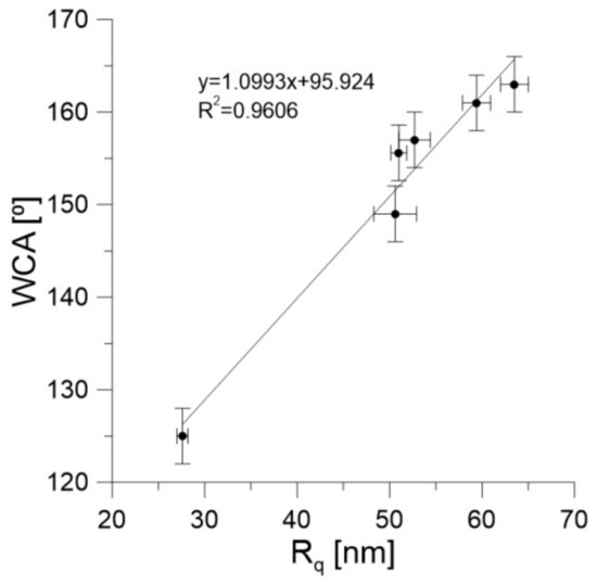 In Figure 4b we show the relation between the DLS diameter and the WCA. As one can conclude, the WCA values decreased with increasing aggregate diameter. This finally leads to the correlation between WCA and the Rq values shown in Figure 5. It can be seen that the WCA values increased with increasing Rq. Moreover, the range of WCA was relatively wide (125–163°).