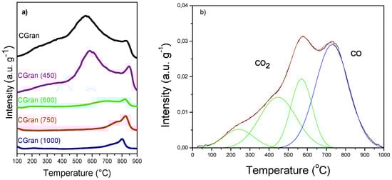 Figure 1a shows that un-modified activated carbon (AC) support presents a shoulder at low temperature (200–400 °C), an intense peak at intermediate to high temperature (500–800 °C), and a weak signal at high temperature (700–900 °C). According to Figuereido et al. [31], the peaks can be assigned to different oxygen surface groups: lactonic groups (200–700 °C) [32,33]; carboxylic (200–300 °C) [32]; phenolic (600–700 °C) [32]; carbonyls (900–1000 °C) [32]; and quinones (700–1000 °C) [33]. The decomposition of these groups can be associated with the release of CO2 or CO, as confirmed by the TPD-MS profiles in Figure 1b for un-modified CGran AC. This result suggests the presence of acidic groups, consistent with previous results which found strong acid sites on CGran AC by TPD profiles coupled to a non-dispersive infrared device [34]. Figure 1 also shows that thermal treatment affects the intensities of the peaks, and correspondingly, the nature and amount of surface oxygen groups. A selective decrease of oxygen functional groups can be observed depending on the temperature of modification: for CGran (450), carboxylic groups decreased, whereas for the other modified AC supports, quinonic groups decreased in the order Gran (600) > CGran (750) > CGran (1000). These TPD results indicate that selective removal of functional groups occurs as the treatment temperature increased, as expected.