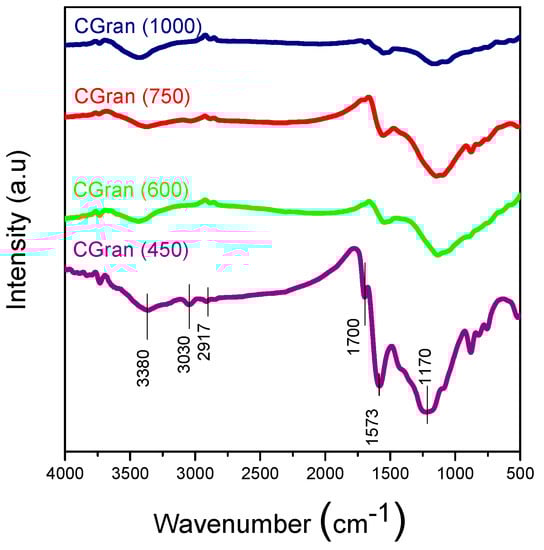 Figure 2 shows the FT-IR spectra of the modified CGran(x) support compared with CGran AC [34]. The characteristic bands of these solids are in the region of 3500–3300 cm−1, assigned to phenolic structures; 1600–1500 cm−1, ascribed to C=O stretching vibrations of lactonic, quinonic, or carboxylic groups, and 1300–900 cm−1, assigned to C–O–C vibrations or C–O stretching of ether, lactonic carboxylic, or phenolic groups [34,35]. In addition, Figure 2 shows a decrease of all the oxygen functional groups with the increase of the temperature of the thermal treatment, which is in agreement with results deduced from TPD profiles.