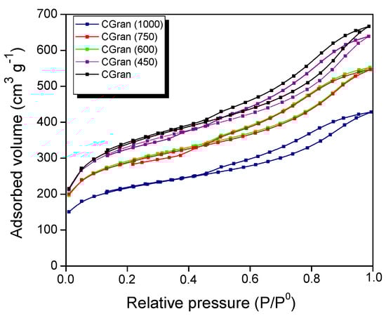N2 adsorption-desorption isotherms at 77 K of CGran and CGran(x) activated carbon supports.