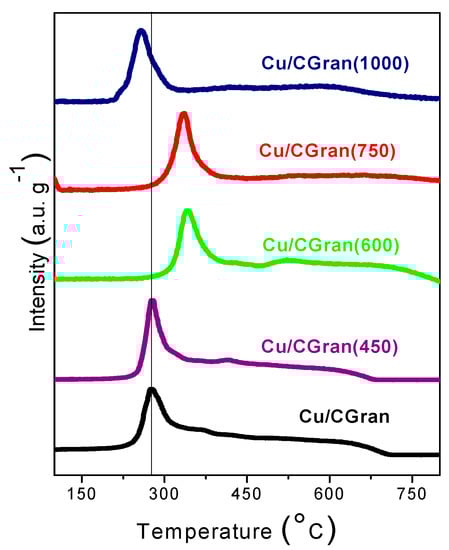 Figure 4 shows the TPR profiles of Cu/CGran and Cu/CGran(x) catalysts. All the catalysts displayed one prominent reduction peak, observed around 270 °C for Cu/CGran, Cu/CGran (450) and Cu/CGran (1000) catalysts, and 350 °C for Cu/CGran (600) and Cu/CGran (750) samples.