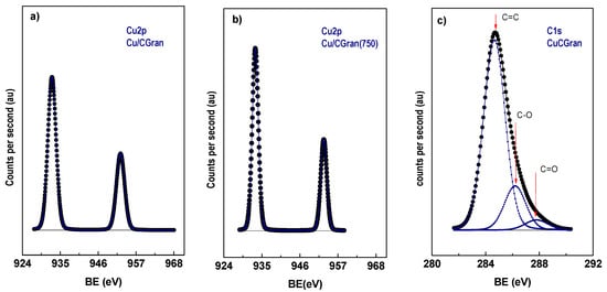 XP spectra of Cu 2p in reduced catalysts (a) Cu/CGran, (b) Cu/CGran(750), and C1s XP spectra for (c) Cu/CGran catalysts.
