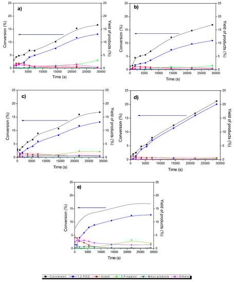 Variation of the transformation of glycerol and the yield of products with time for (a) Cu/CGran, (b) Cu/CGran(450), (c) Cu/CGran(600), (d) Cu/CGran(750), (e) Cu/CGran(1000) catalysts.
